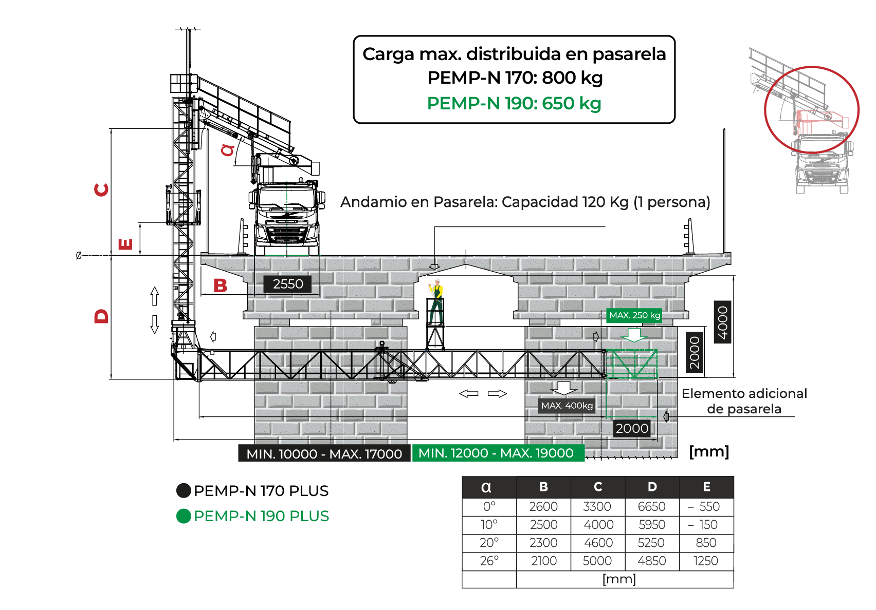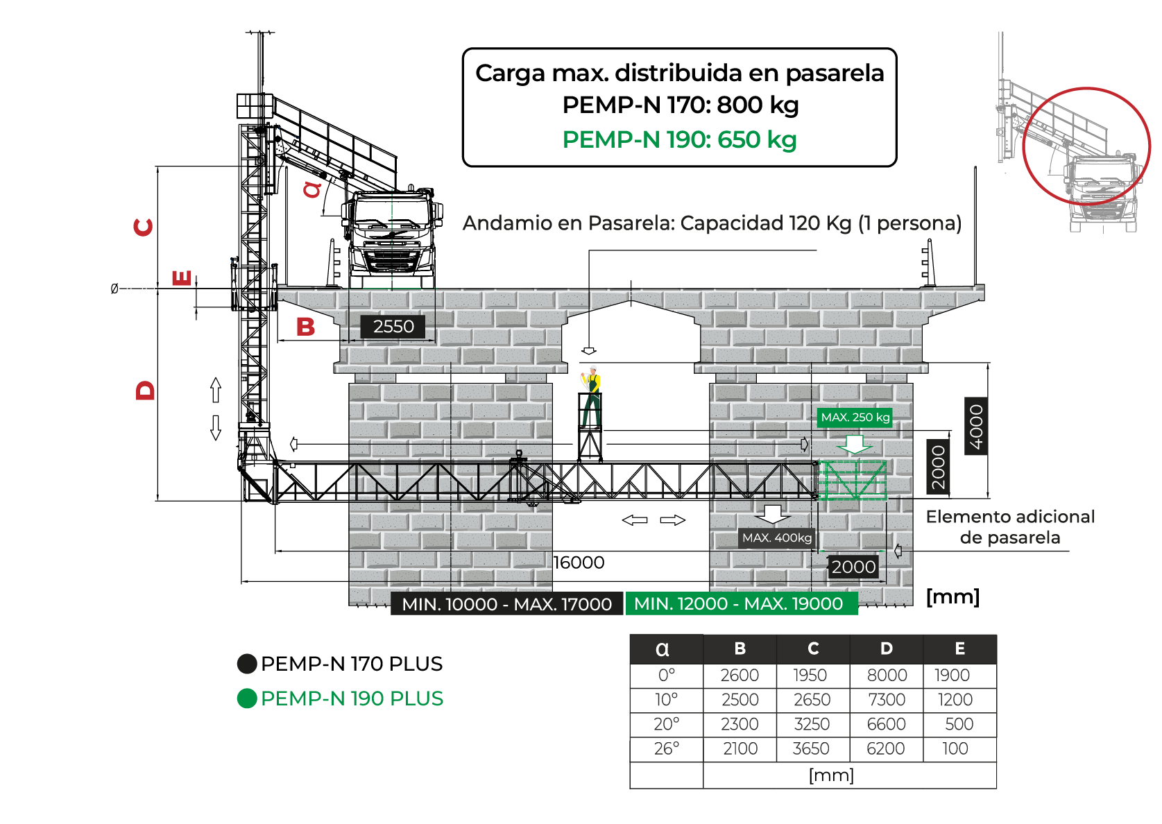 La PEMP-N 170 prioriza la capacidad de carga, con hasta 800 kg en pasarela y 400 kg en punta, mientras que la PEMP-N 190 amplía el alcance horizontal hasta 19 m, aunque reduce la carga máxima a 650 kg y 250 kg en punta.