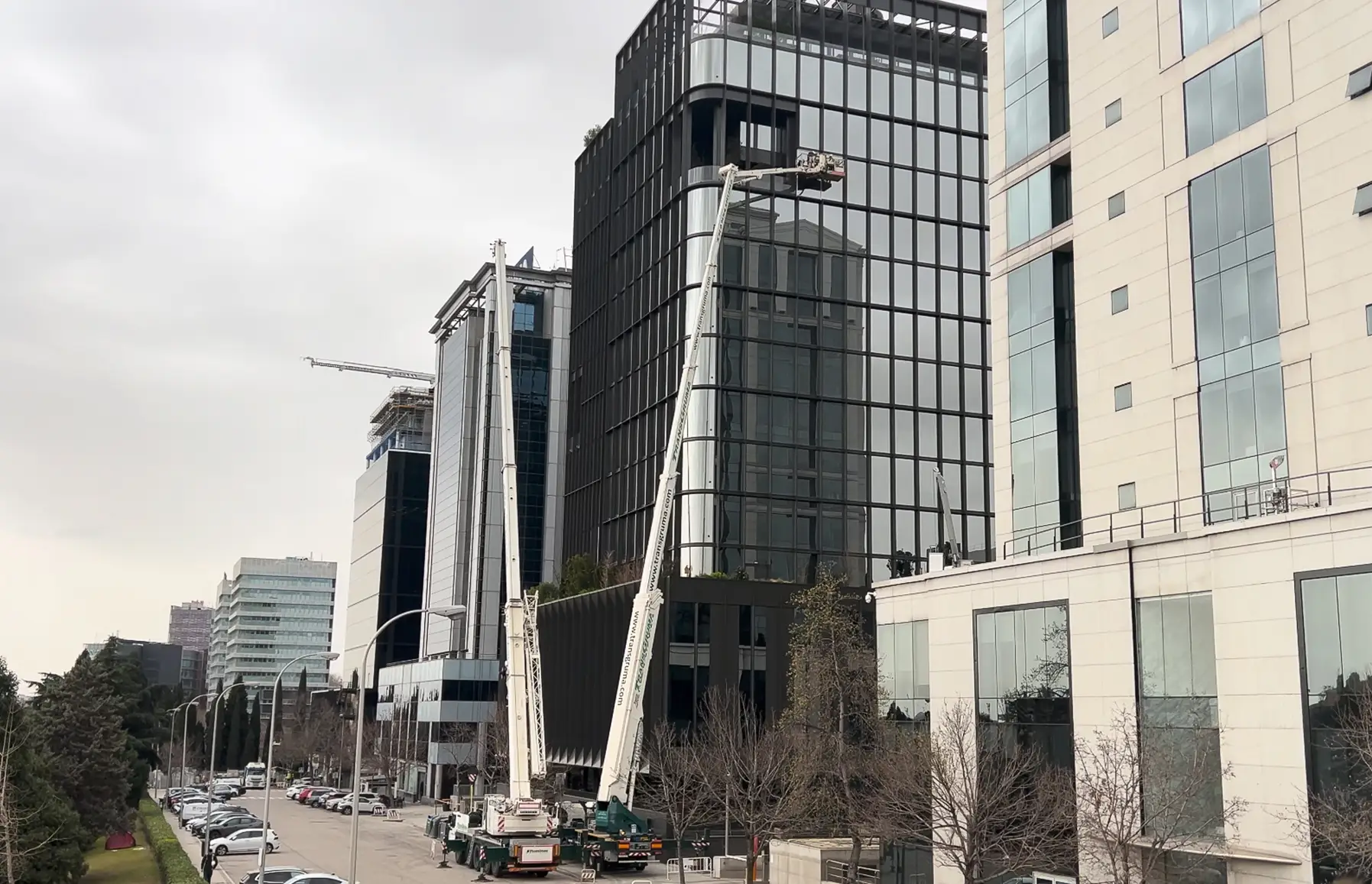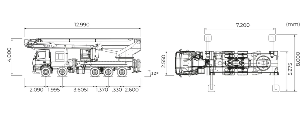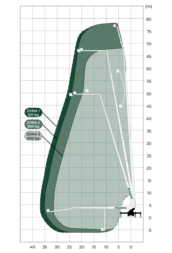 Plataforma elevadora sobre camión bifuncional que permite elevar personal hasta 78 m y trabajar con un alcance horizontal de hasta 37,5 m. Incorpora minigrúas para elevación y carga de forma simultánea, lo que agiliza intervenciones en altura. Muy útil en trabajos de reparación y limpieza en aerogeneradores, fachadas y cubiertas.